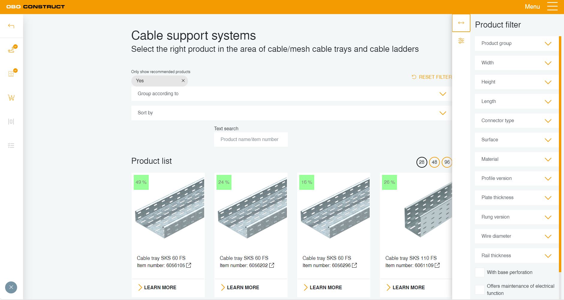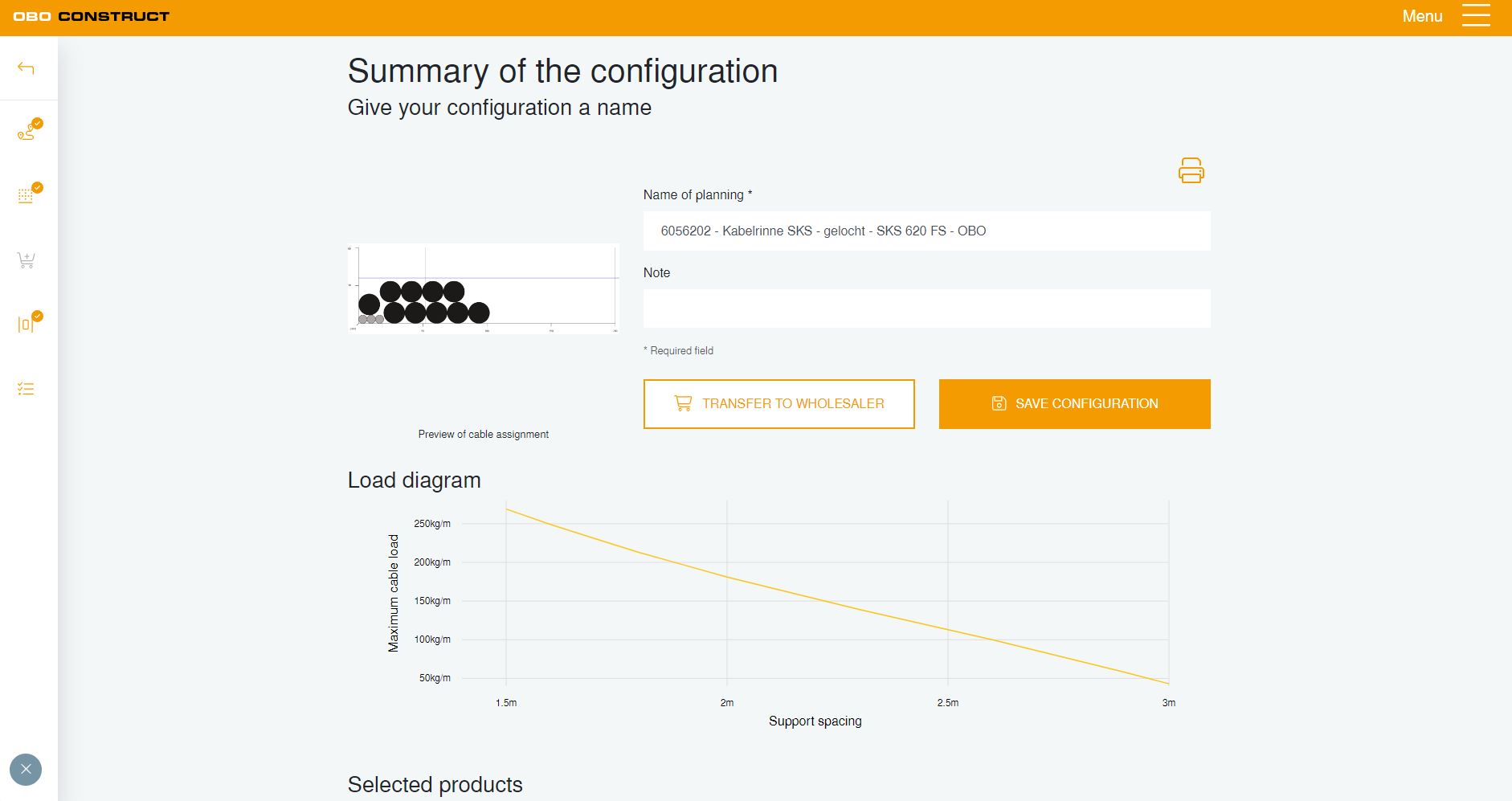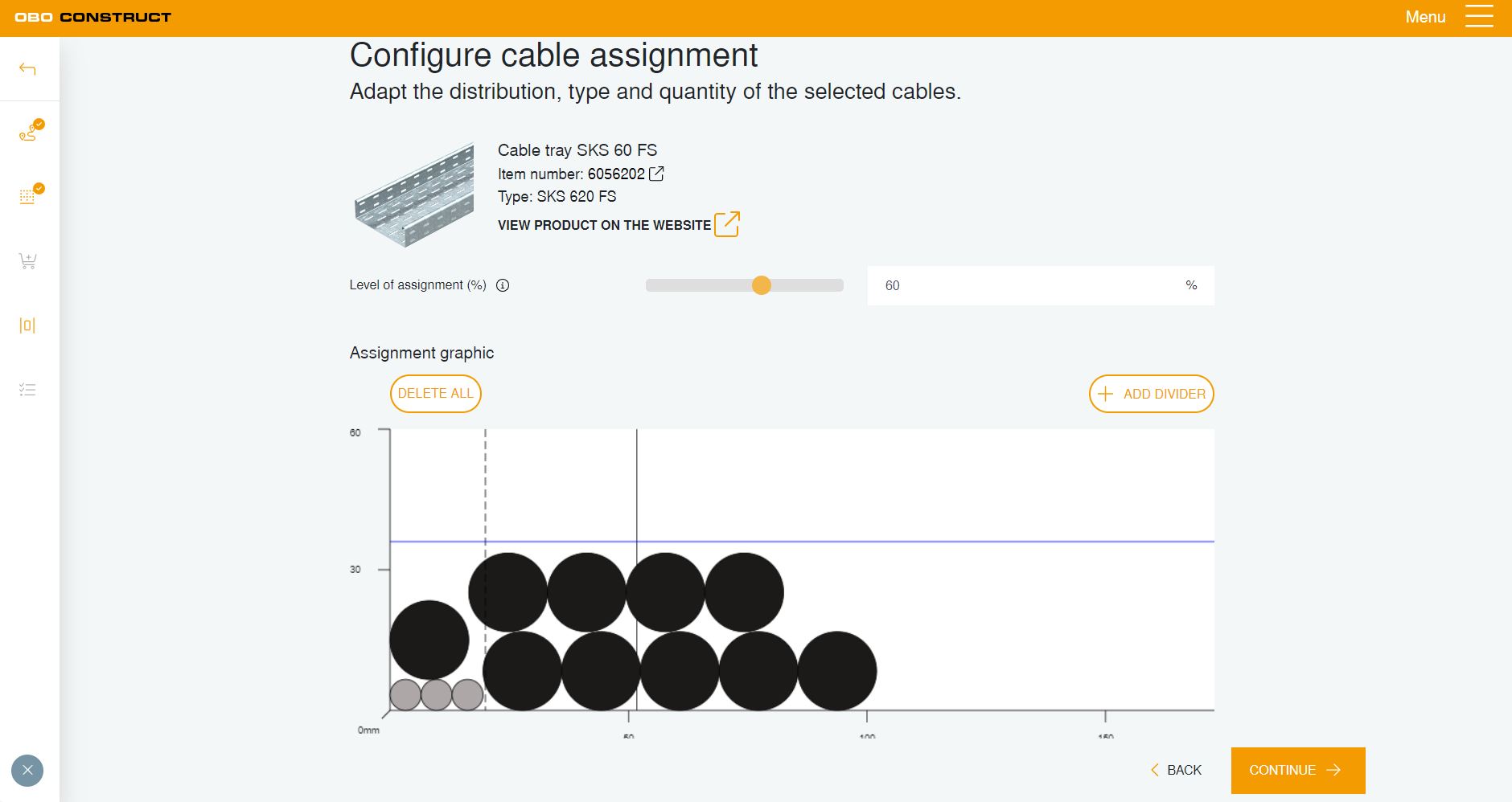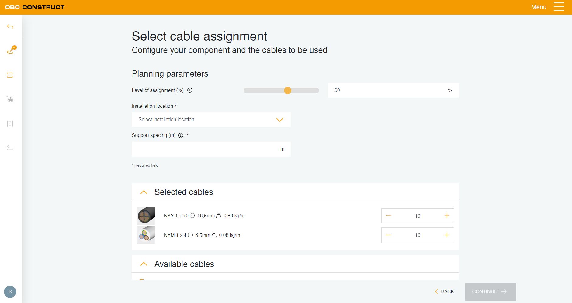 A tervezőeszköz lehetővé teszi, hogy egy projekten belül megadjuk a kábelmennyiséget mind a kábeltartó rendszerek, mind a padló alatti szerelőcsatornák esetében. Könnyen megadhatók a különböző elhelyezési paraméterek, úgy mint a felszerelés helye, az alátámasztás távolsága és az elhelyezés foka éppúgy, mint a kábelek, illetve vezetékek fajtája, mennyisége és így lépésről lépésre eljuttatják a felhasználót a termékkiválasztáshoz