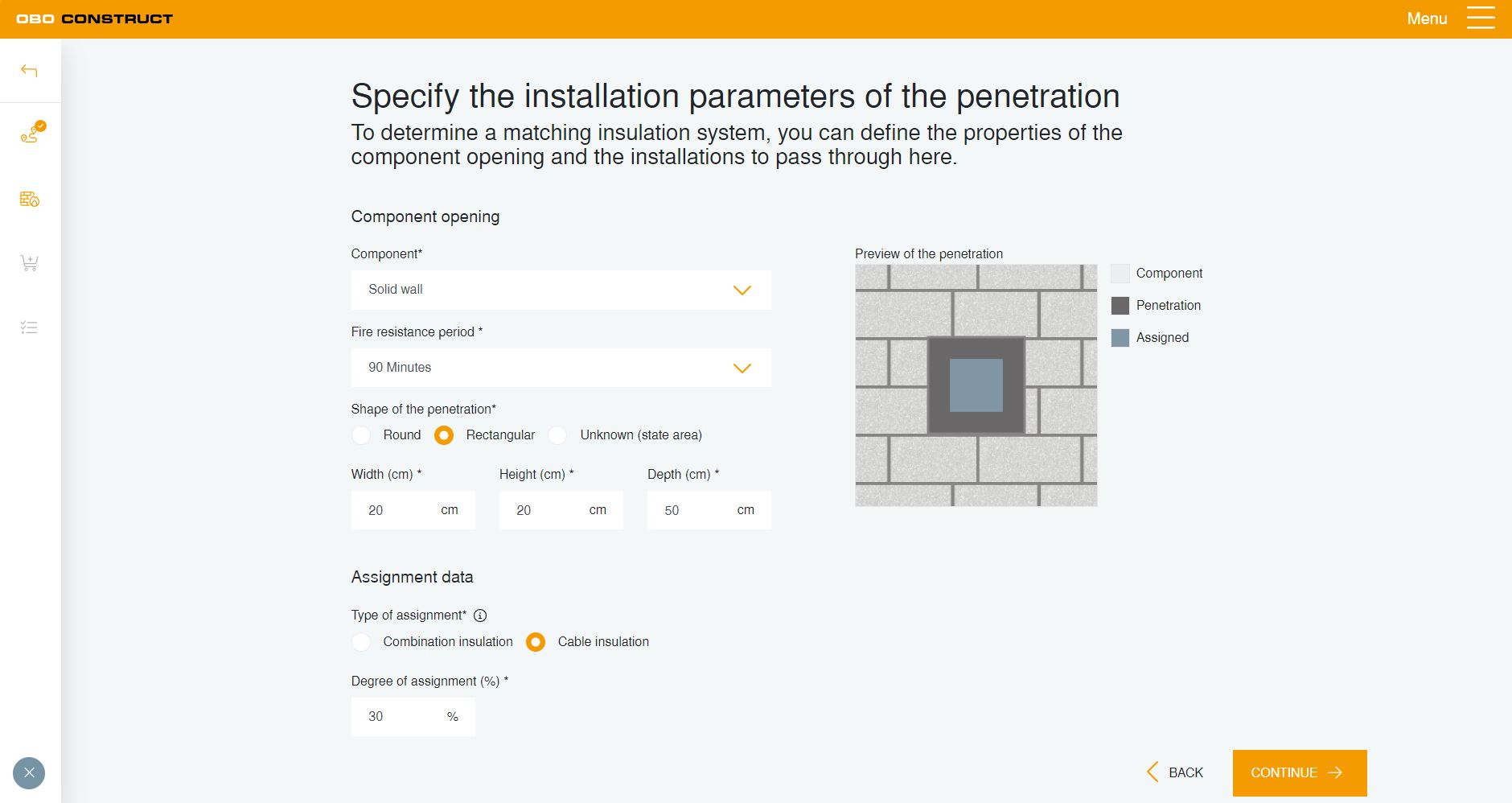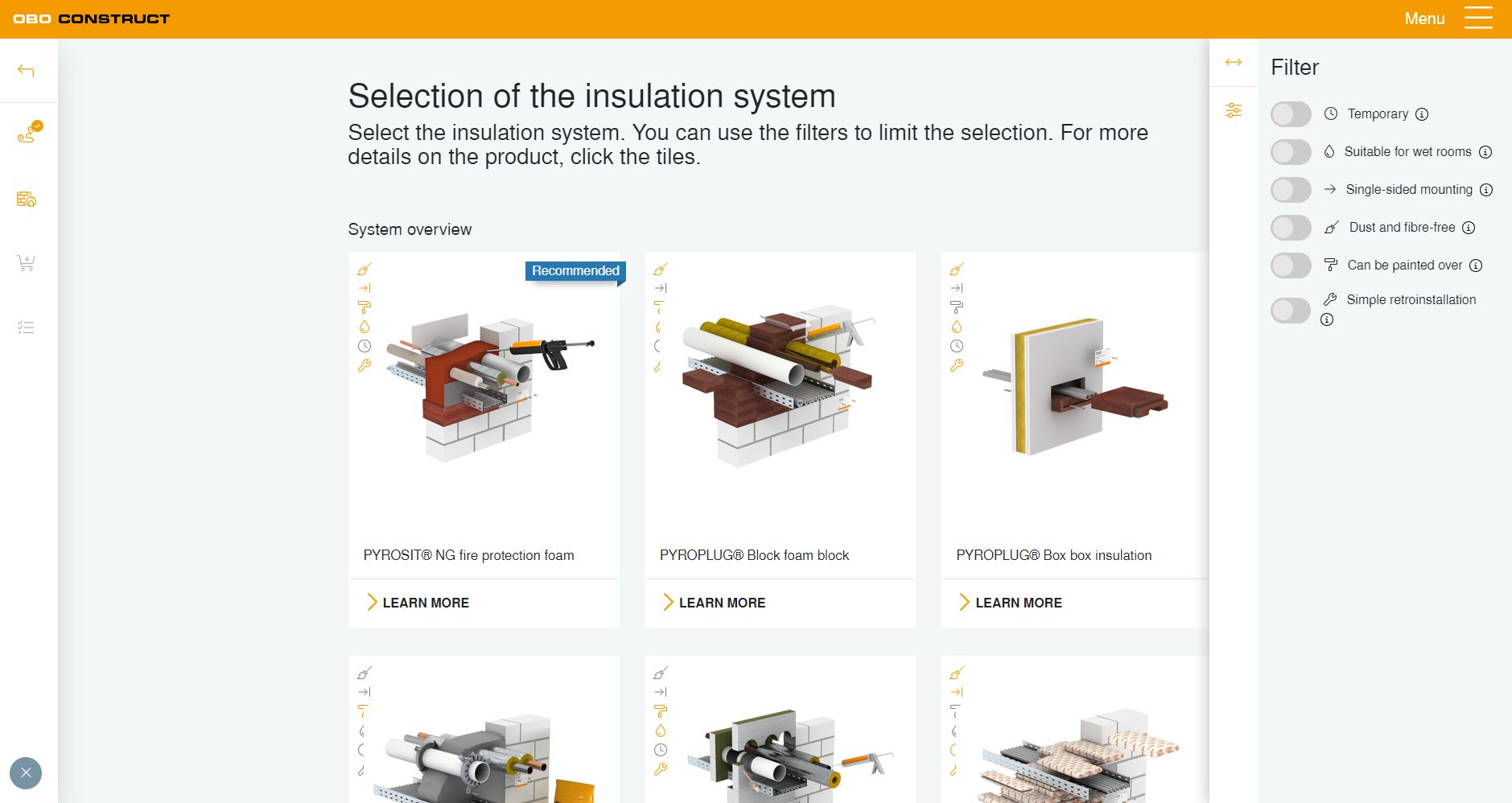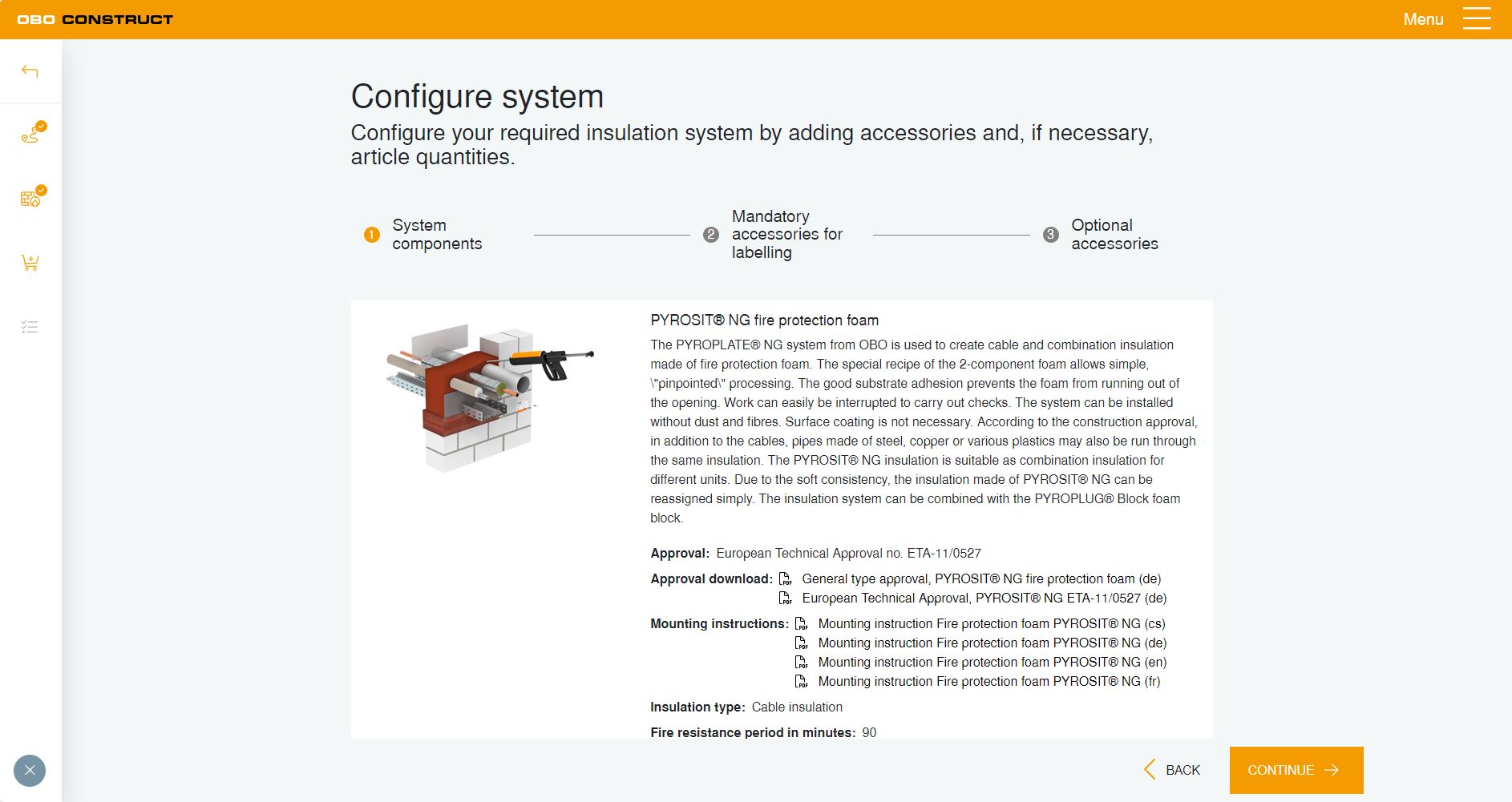 A méretek és az áttörésen átvezetendő installációk megadása után az eszköz kiszámítja például a szükséges tűzvédelmi hab vagy tűzvédelmi blokkok mennyiségét. A termékek kombinációi is kiszámíthatók, és a szükséges kiegészítők egyszerűen és kényelmesen hozzáadhatók.