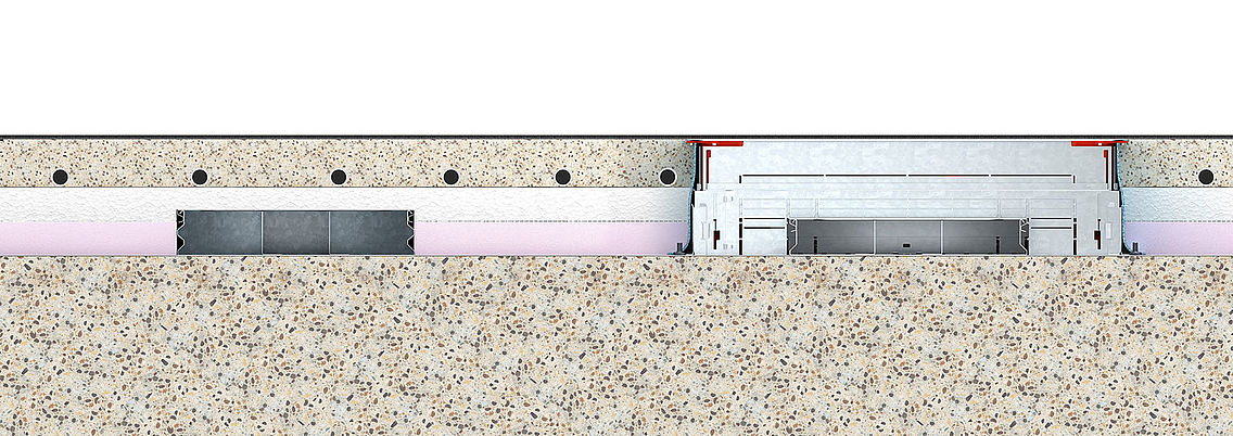 Az EÜK-rendszer szerelőcsatornái és padlódobozai közvetlenül az aljzatbetonra szerelhetők. A hőveszteség elkerülésére és a lépészaj csökkentésére szigetelő rétegek kerülnek beépítésre. Ezek a szigetelő rétegek a csatornarendszert teljesen körülveszik. Az esztrichben padlófűtéssel is kombinálhatók. A csatornarendszer ez esetben a padlófűtés alatt, a szigetelőrétegben teljesen elkülönítve helyezkedik el.