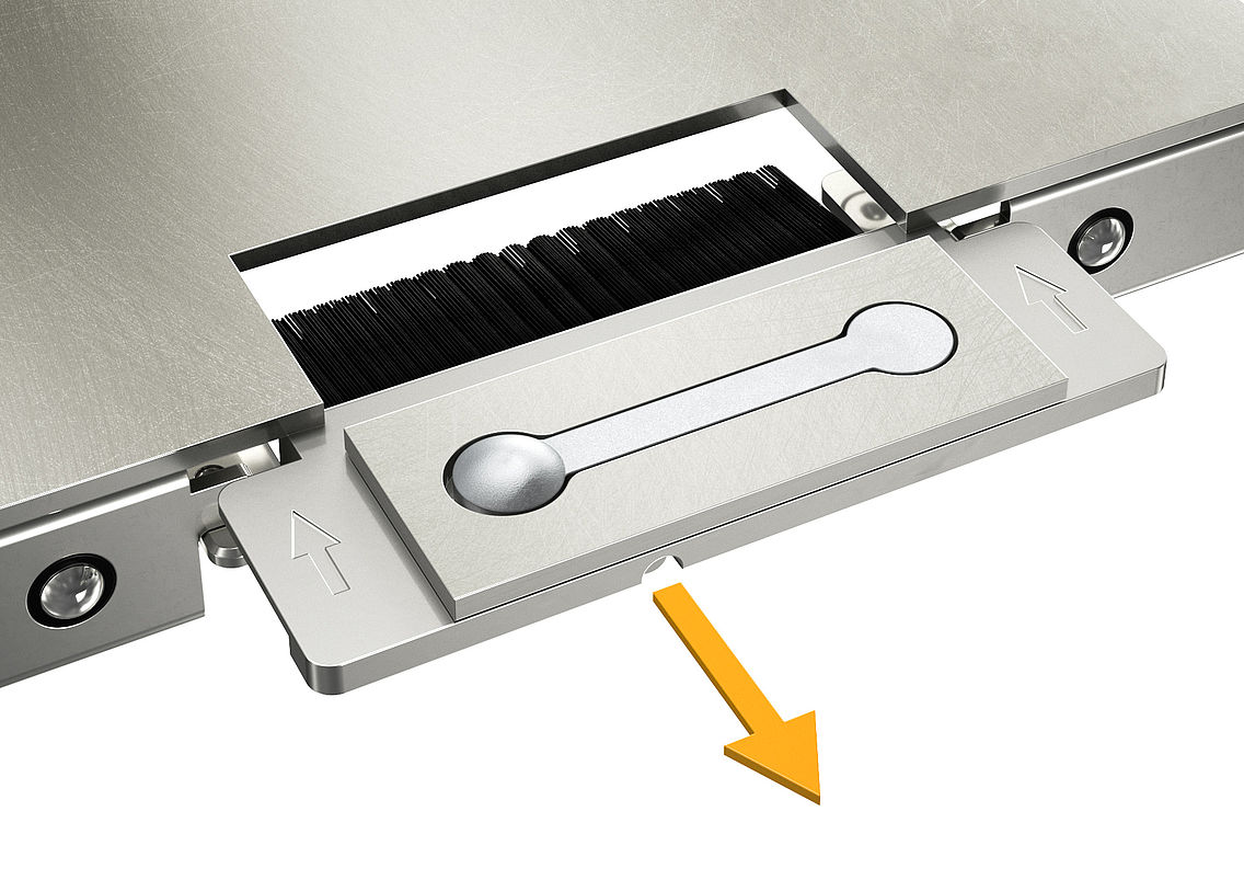 Használat közben a kábelek diszkréten vannak elvezetve. A szabadalmaztatott kefés kábelkivezető kialakítása letisztult, visszafogott, amely a lapos nyitószerkezetnek köszönhetően rugalmasan és harmonikusan illeszkedik a meglévő belső terekbe. Ennek köszönhetően biztonságos az elektromos installáció, amely megfelel a magas esztétikai követelményeknek is.