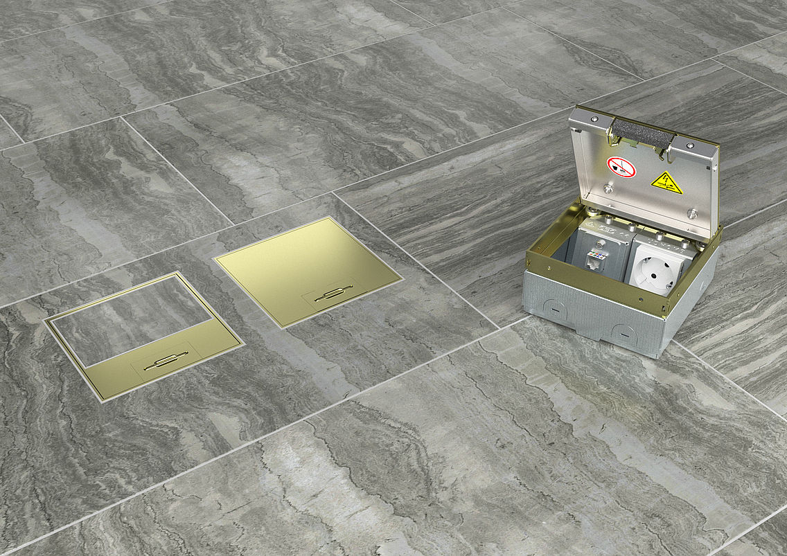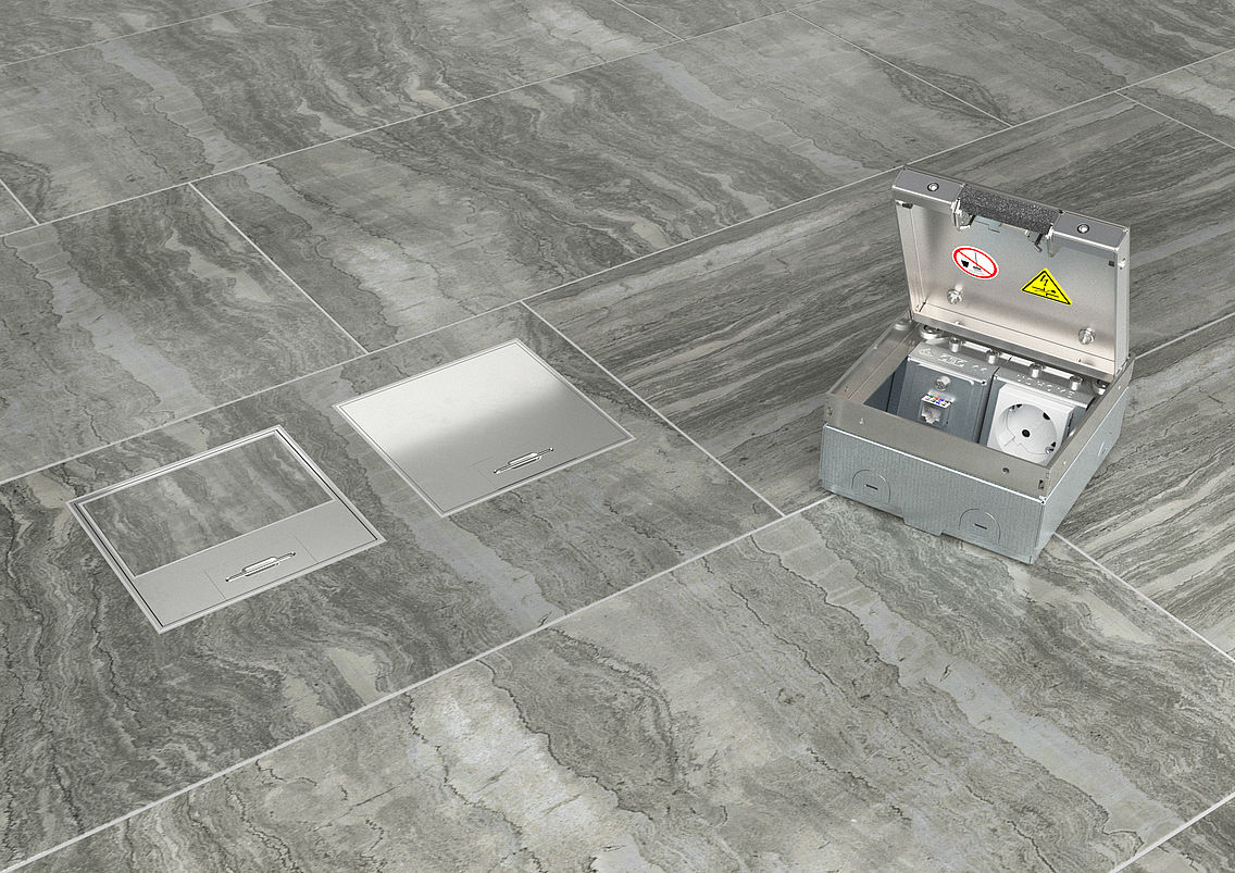 Bármelyik fedelet is választja, a padlódoboz magasságát nem kell beállítani vagy újra szintezni. A kábelek és vezetékek a fedélbe beépített kábelkivezetőn keresztül vezethetők ki. A fedél szélén lévő golyós retesz közvetlenül a padlódoboz alsó részébe pattintja, s rögzíti a fedelet. Ezáltal egy erős és formatartó kapcsolat jön létre a doboz és a fedél között, amely garantálja a fedél tökéletes illeszkedését.