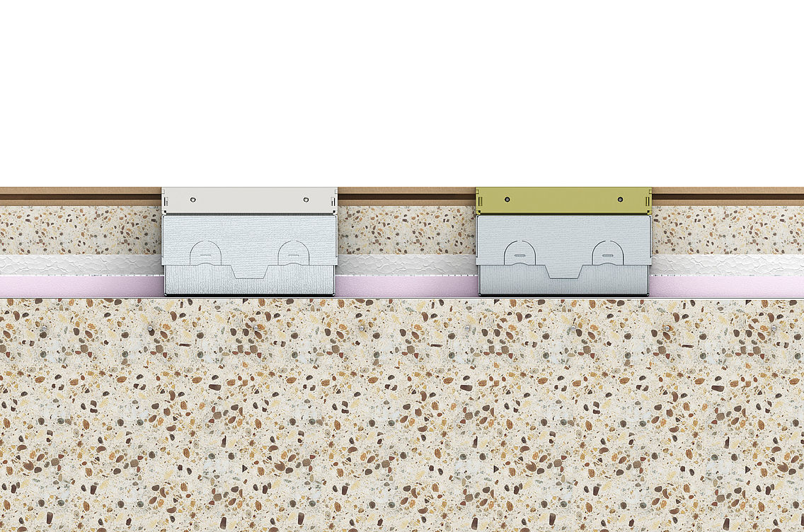 Az UDHOME padlódobozok rendkívül helytakarékos módon építhetők be a padlószerkezetbe. A padlódobozok, flexibilis csövekkel összekötve közvetlenül az aljzatbetonra kerülnek és végül az esztrich rétegbe építhetők be.