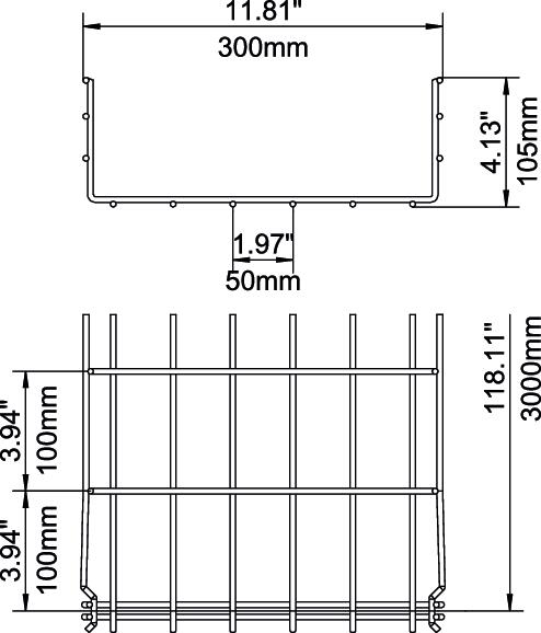 A GRM típusú rácsos kábeltálcák toldásához nincs szükség kiegészítő összekötő elemekre, egyszerűen csak egymásba kell pattintani a tálcákat. A rácsosztás 50 x 100 mm.