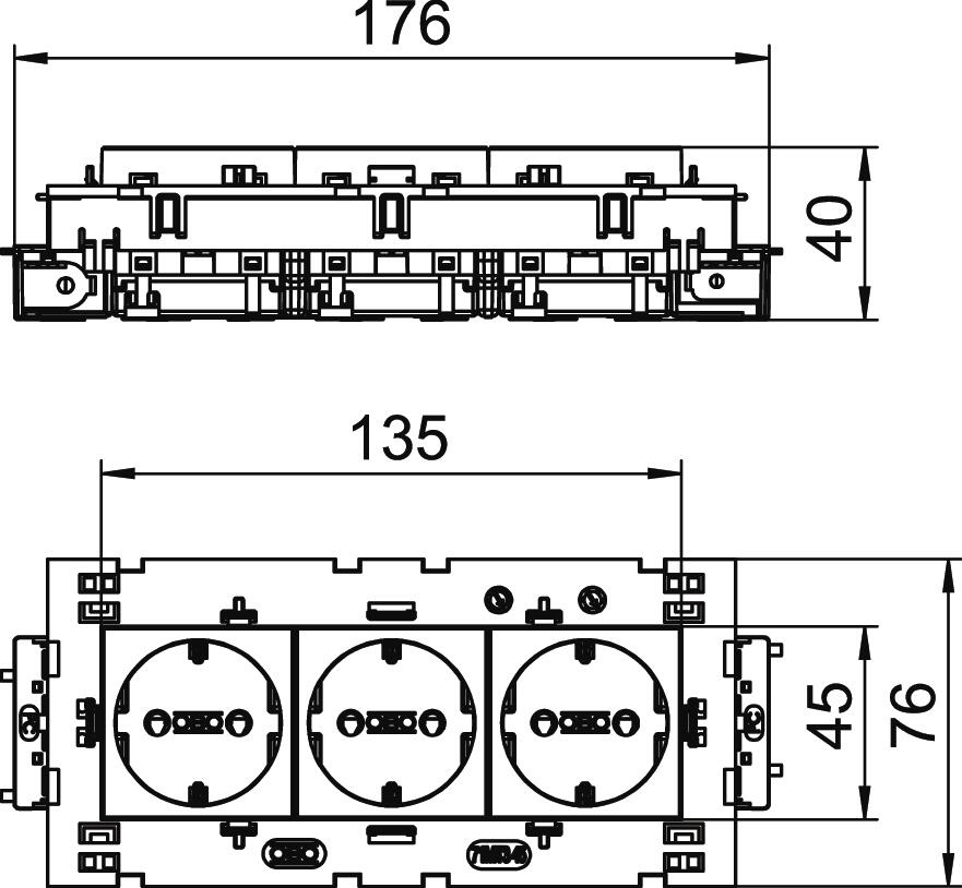 Termékleíráshármas, 0°-os oldalsó csatlakozású védőérintkezős csatlakozóaljzat, fokozott érintésvédelemmel, nyomórugós csatlakozókapcsokkal, 2P+F, 16 A, 250 V~, IEC 60884-1 szerinti összekötő kapcsokkal, Rapid80 szerelvénybeépítő csatornába történő szereléshez.